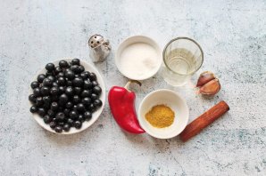 Подготовьте все необходимые ингредиенты для приготовления аджики из черноплодной рябины на зиму. Ягоды снимите с веточек, переберите, сполосните и дате обсохнуть.