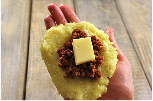 Шаг 3. Тщательно вымешиваем рисовое тесто. Делаем из него лепешки и начиняем их кусочками моцареллы. Формируем аккуратные шарики.