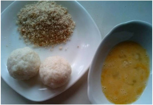 Обваливаем шарики в яичной смеси, потом в муке и панировочных сухарях.