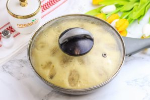 Накройте емкость крышкой и поместите на плиту, включая минимальный нагрев. Томите пирог примерно 20-25 минут в зависимости от ширины вашей сковороды.