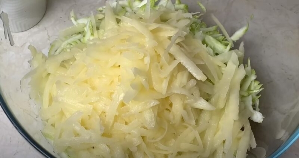 Удаляем у цукини плодоножки и натираем на крупной терке. Солим смесь из цукини, оставляем на 10 минут. В это время очищенный картофель аналогично измельчаем на терке.