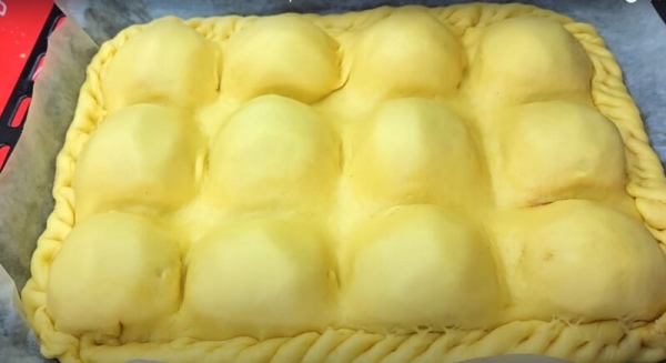 Накрываем яблоки вторым пластом теста, защипываем края. Прижимаем один пласт ко второму в промежутках между яблоками.