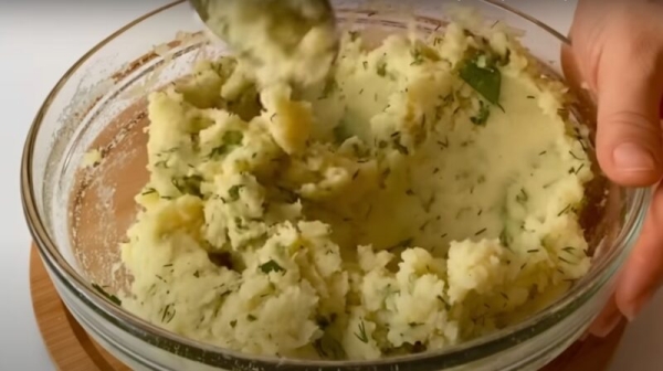После того, как картошка сварилась, ее не обходимо размять до состояния однородной массы.