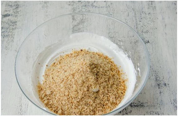 Шаг 6. В белковую массу выкладываем измельченные орехи.