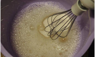 Шаг 3. Снимаем заготовку с бани и взбиваем венчиком до плотной блестящей массы. На это уйдет около 10-12 минут.