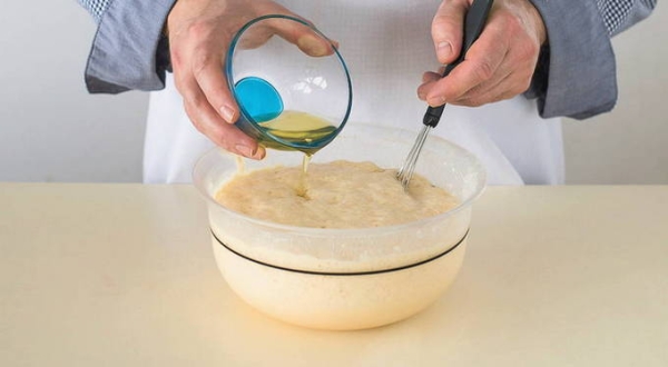 3. Кипятим воду и даем ей остыть до комнатной температуры. Переливаем к остальным ингредиентам. Сразу добавляем растительное масло и начинаем вымешивать массу, пока не исчезнут все комочки.