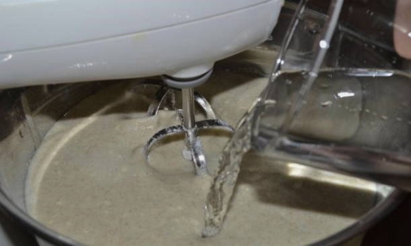 Шаг 5. Вливаем воду. Ее количество можно регулировать по своему усмотрению. Добавляйте столько, сколько возьмет тесто.