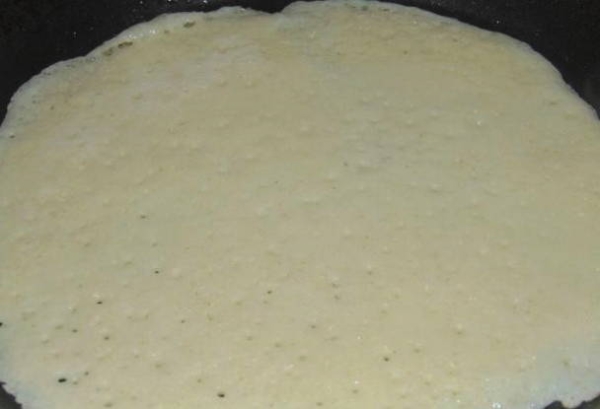 3. Хорошо прогреваем сковороду с растительным маслом. Вливаем сюда немного теста, равномерно распределяем его и начинаем обжаривать на умеренном огне.