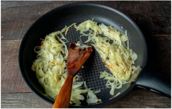 Шаг 2. Очистите головку репчатого лука, помойте и мелко нарежьте его. Затем пассеруйте лук на растительном масле до золотистого цвета.