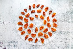 Установите сетки с подготовленными дольками абрикосов в сушилку и сушите в течение 8-12 часов до готовности. Абрикосы должны перестать липнуть к рукам, но при этом оставаться упругими.