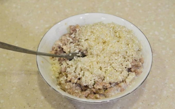 Шаг 2. К мясной составляющей высыпаем рисовую крупу, отваренную в подсоленной воде до полуготовности.