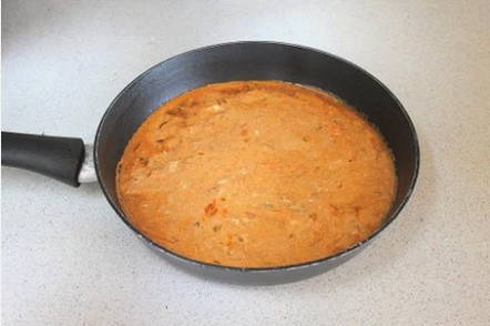 Шаг 5. Для соуса в сковороде быстро подрумяниваем оставшиеся овощи и добавляем сметану, томатную пасту, второй измельченный зубчик чеснока и немного соли – доводим до кипения.