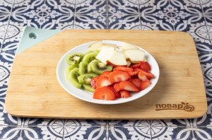 Нарежьте на ломтики среднего размера клубнику, киви и яблоко.