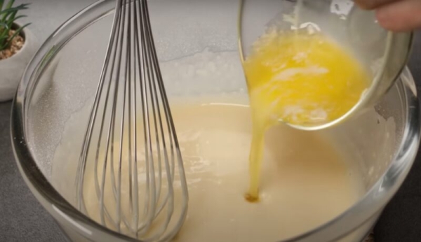 Растапливаем сливочное масло в микроволновке. Взбиваем тесто для блинов венчиком, продолжаем вливать в тесто тонкой струйкой молоко.