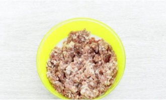 Шаг 5. Затем в эту массу переложить мясной фарш и перемешать рукой, что будет удобнее, чем ложкой.