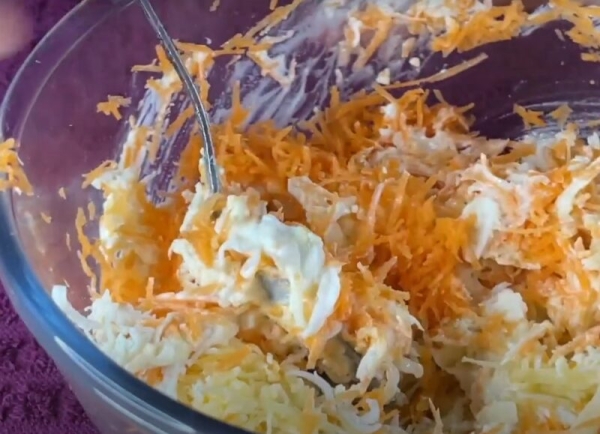 Натираем на маленьких резцах терки очищенную морковь и яйцо. Пропускаем через пресс зубчики чеснока, добавляем к яйцу и моркови.