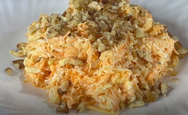 Получается простой салат Киевский. Это хороший вариант закуски для праздничного стола.