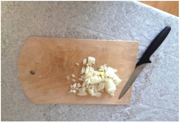 Шаг 2. На кубики рубим луковицу.