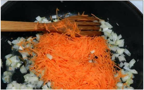 Шаг 3. Следом отправляем морковную стружку, перемешиваем и обжариваем до мягкости и легкой золотистости.