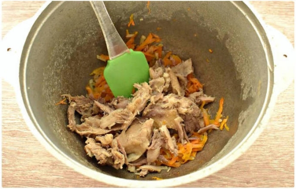 К румяному луку перекладываем мясной компонент.