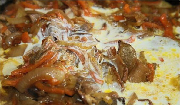 Шаг 7. Добавляем грибы и томим кушанье на среднем нагреве еще 15 минут.