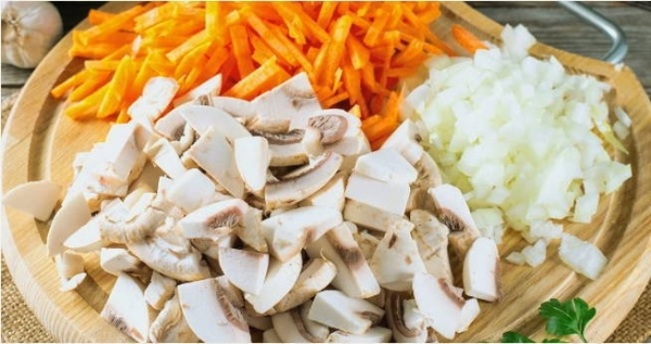 Шаг 1. Первым делом очищаем и ополаскиваем корнеплоды: луковицу мелко рубим, а морковь натираем на терке. Грибы нарезаем небольшими сегментами, горстку режем крупно.