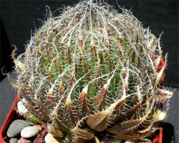 Отростки на листьях хавортии паутиновидной переплетаются, «пряча» цветок под «куполом»