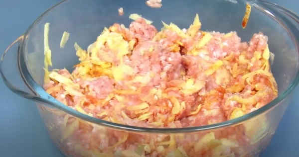 Натираем картофель на крупной терке. К картофельной массе добавляем фарш и специи. Мясную массу нужно вымесить так, чтобы ингредиенты равномерно распределились между собой.