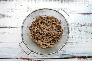 В кастрюлю налейте полтора литра воды, посолите и доведите до кипения. Опустите гречневую лапшу одной стороной в кипяток и варите в течение 8 минут. Лапша сама опустится в кастрюлю по мере размягчения. Лапша должна быть сварена, но остаться плотной. Откиньте лапшу на сито и дайте воде полностью стечь.