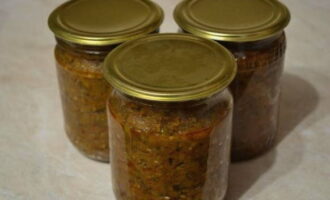 Шаг 12. Икра на зиму из баклажанов, кабачков и помидоров готова. Можно уносить на хранение в прохладное место.