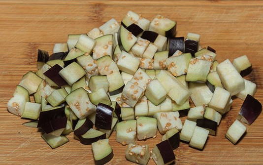 Шаг 3. Такими же кубиками нарезаем баклажаны. Если хотите убрать горечь овоща, то присыпьте его небольшим количеством соли и оставьте на время.