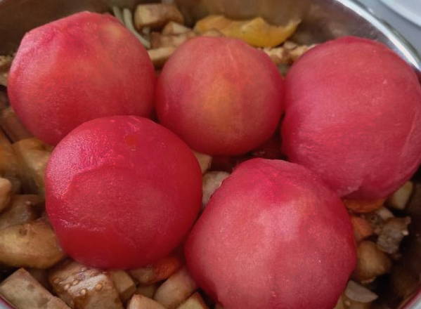 Шаг 9. Охлаждаем помидоры, очищаем от кожуры, измельчаем и выкладываем к остальным овощам.