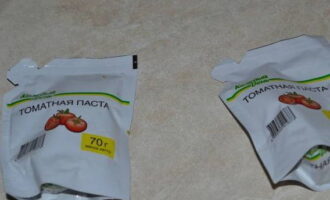 Шаг 11. Убираем овощи в сторону сковороды и вливаем томатную пасту.