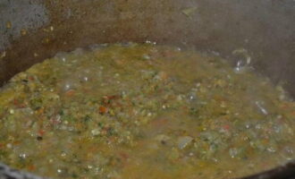 Перекладываем овощную массу в казан к луку. Томим их и постоянно помешиваем.