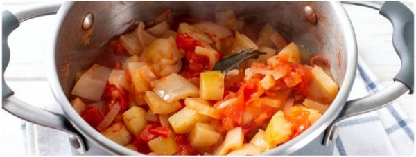 Шаг 6. Все овощи отправляем к ломтикам помидоров и ставим на конфорку. Томим на протяжении 40 минут, а за 10 минут до готовности добавляем специи, соль и уксусную эссенцию.