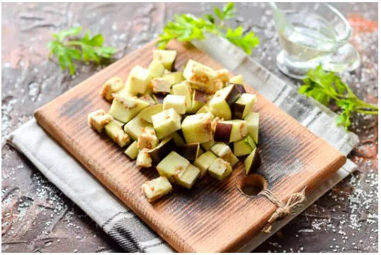Шаг 3. Баклажаны нарезаем кубиками, присыпаем солью и даем полежать 15 минут – так, вся горечь выйдет вместе с соком.
