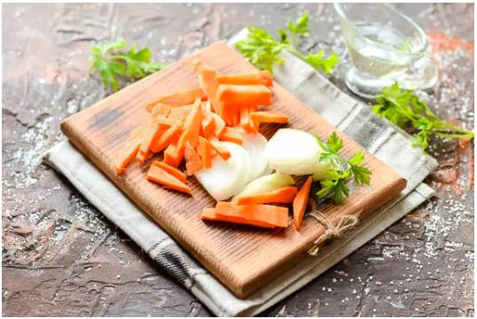 Шаг 5. Морковку нарезаем брусочками, а лук – полукольцами.