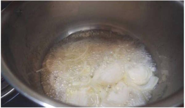 Шаг 4. В специальной кастрюле для тушения разогрейте стакан растительного масла и обжарьте на нем нарезку лука.