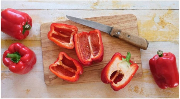 Шаг 1. Промыть болгарский перец, насухо вытереть салфеткой, разрезать пополам и удалить семена с перегородками.