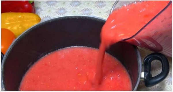 Шаг 4. Полученную помидорную массу перелить в специальную для тушения кастрюлю и на большом огне довести до кипения. В нее переложить нарезку кабачков и болгарского перца.