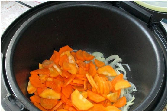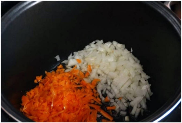 Шаг 1. В чашу мультиварки наливаем растительное масло и прогреваем его в режиме «Жарка», засыпаем измельченную морковь с луком и жарим около 5 минут.