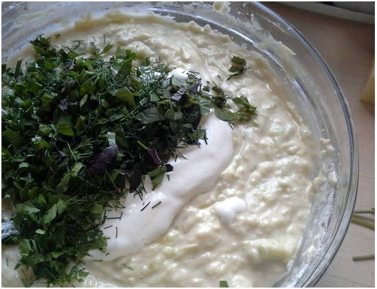 Шаг 3. Дополняем массу солью, молотым перцем, рубленой зеленью и сметаной.