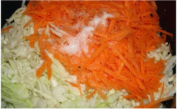 Шаг 2. Часть кочана капусты мелко шинкуем и растираем руками с солью, кладем поверх овощных кубиков.