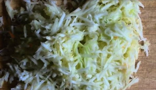 Шаг 2. Очищаем кабачок и так же его натираем. Выкладываем к моркови.