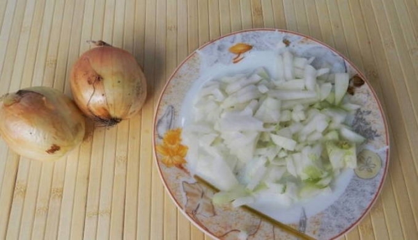 Шаг 4. Очищаем репчатый лук и мелко нарезаем его.