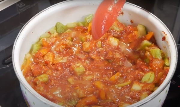 На сильном огне доводим овощи до кипения, затем варим 10 минут на среднем огне. Кладем на поверхность овощей томатную пасту, соль и сахарный песок, слегка перемешиваем и варим еще 10 минут.