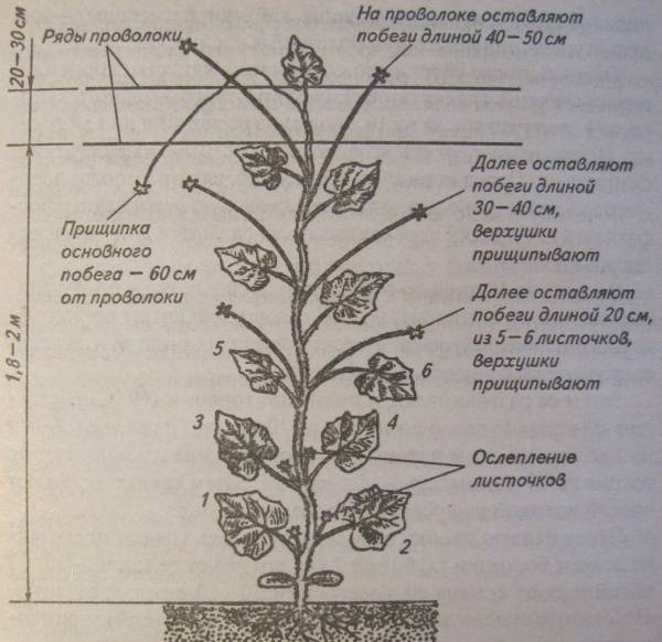 На высоте 2 м над рядами нужно установить вертикальные шпалеры, к ним в дальнейшем с помощью шпагата будут подвязываться растения. Когда растение достигает верхней точки шпалеры, делают прищипку на основном побеге на уровне второго или третьего листа стебля. В будущем, чтобы ускорить плодоношение огурцов, прищипку следует делать на уровне 4-5 листа.