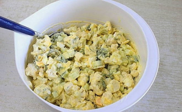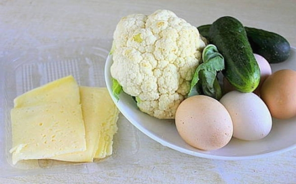 Вкусный салат из цветной капусты – эта закуска получается настолько сытной, что может быть подана в качестве самостоятельного блюда. Его питательную основу составляют яйца, сыр и майонез, а им в дополнение идет легкость цветной капусты и свежесть огурчика.