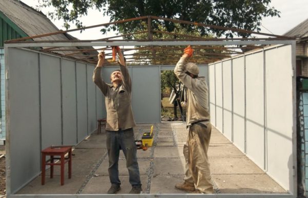 Завершив установку ферм, переходят к обшивке кровли и внешних сторон стен металлическим листом или профилем. Здесь желательно использовать материалы толщиной около 2 мм, что обусловлено несколькими моментами. Во-первых, можно делать более качественные сварные соединения, не прожигая их насквозь. Во-вторых, обеспечивается достаточно надежная конструкция без использования дополнительных деталей на укосины, прожилины и поперечины как на стенах, так и на элементах кровли. В-третьих, тонкие листы практически неустойчивы к коррозии, при малейшем ее проявлении могут образоваться сквозные отверстия.