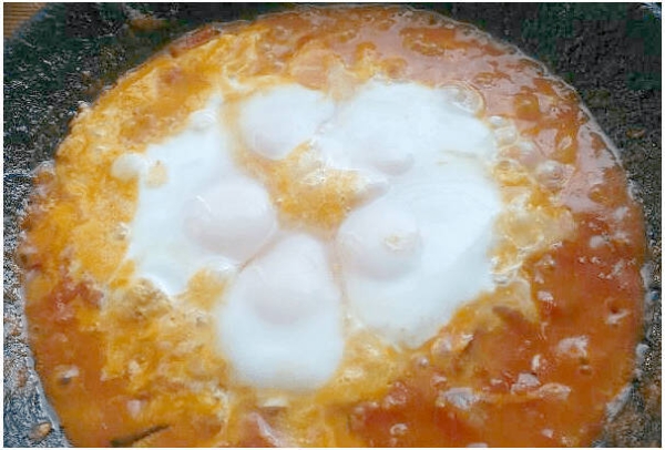 Когда кружочки помидоров поджарятся с обеих сторон, а лук станет полупрозрачным, разбейте куриные яйца. Посолите и приправьте блюдо по вкусу.